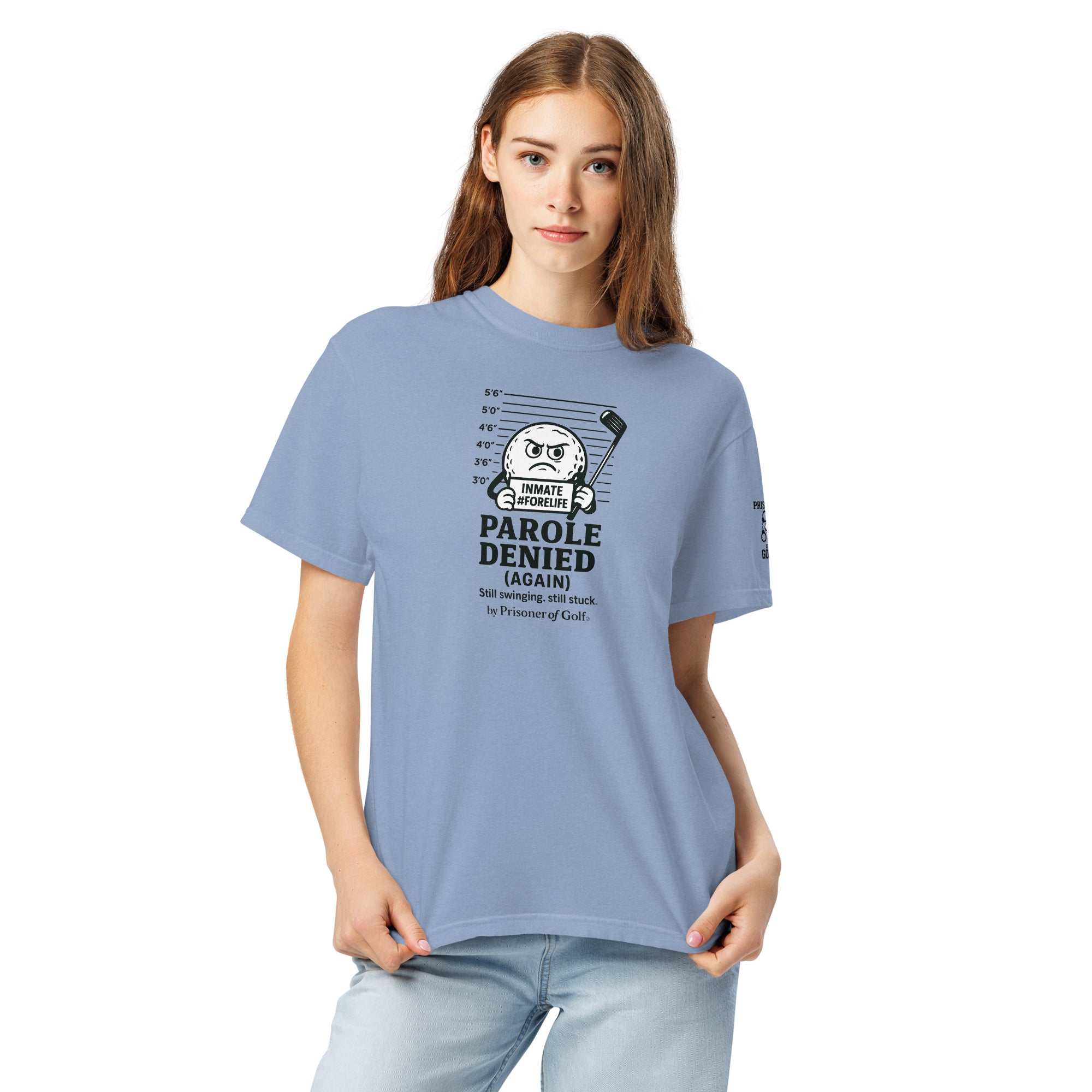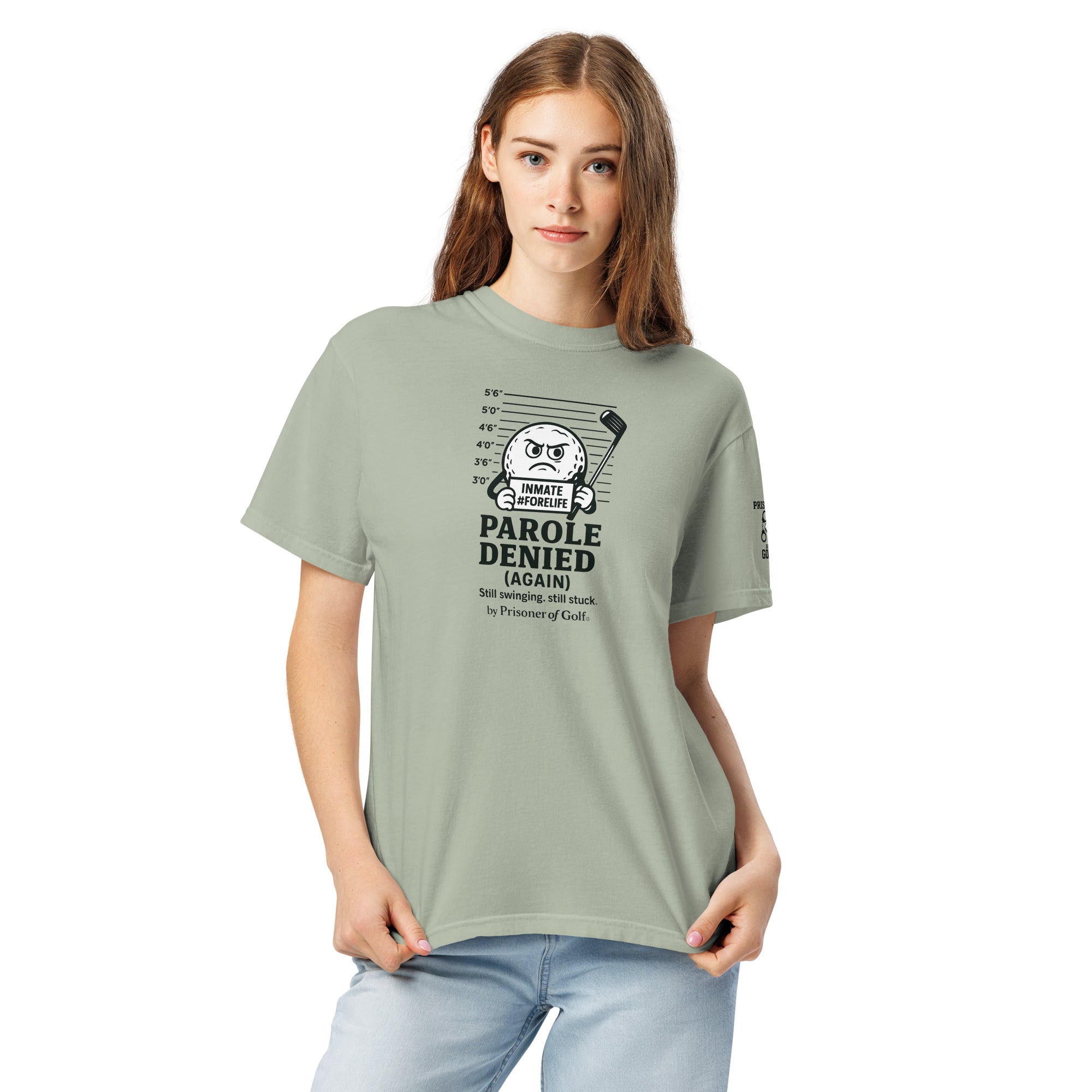 Parole Denied across the front says it all—no excuses, no escape, no early release. The Prisoner of Golf™ logo sits on the sleeve like a patch earned through years of hard time under pressure, frustration, and the occasional miracle shot that keeps you hooked.